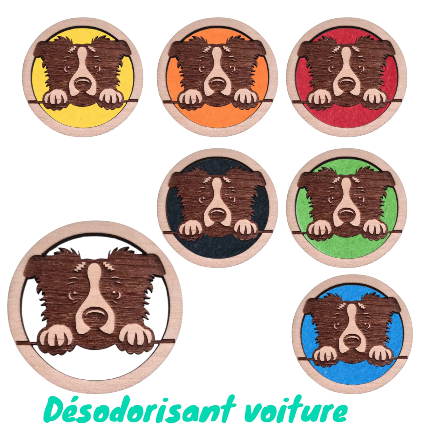 Découvrez notre désodorisant voiture chien Border Collie clipsable pour ventilation, fabriqué en bois avec une feutrine intérieure et orné d’un joli design.