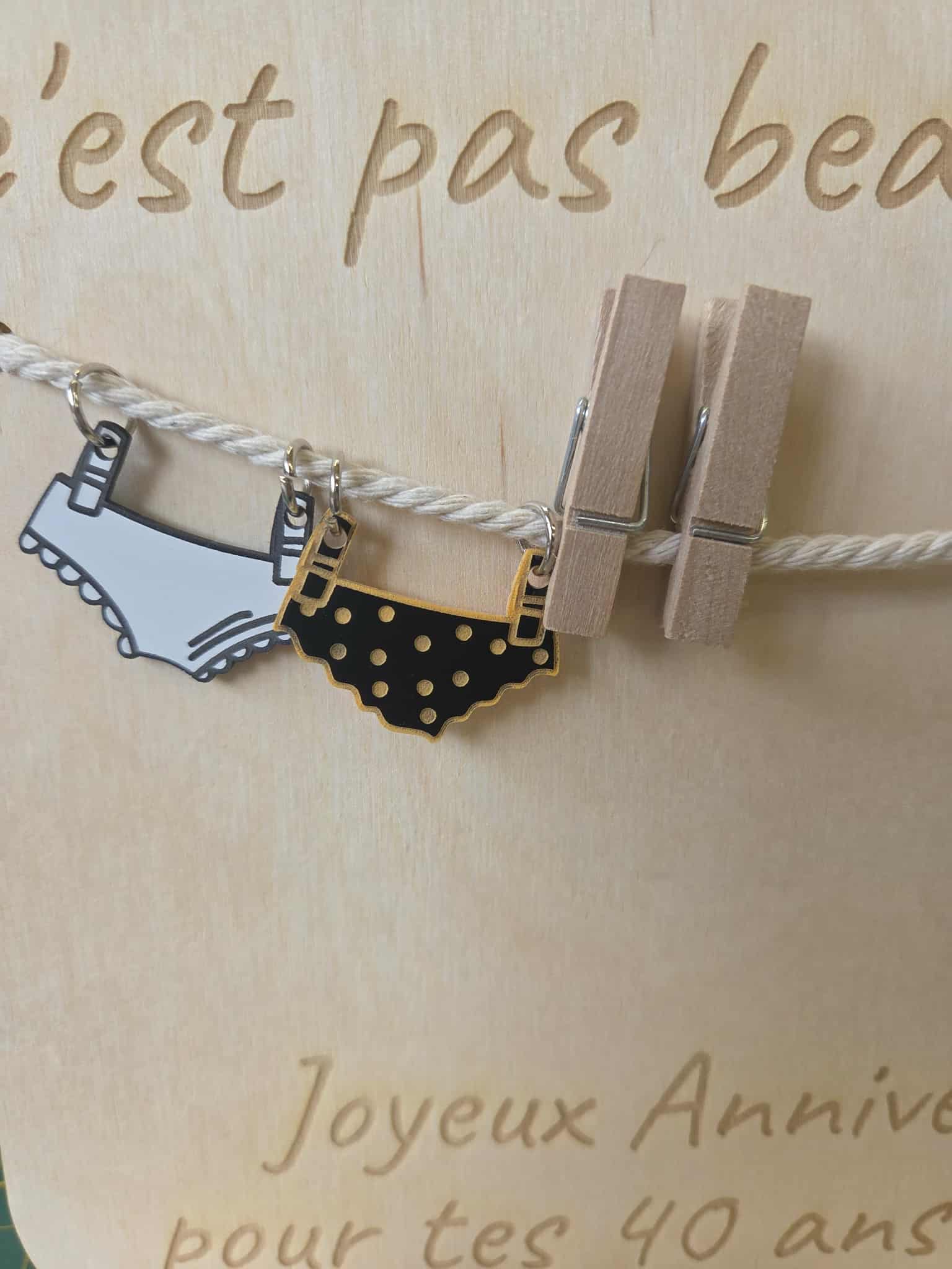 Design | Gravure laser + mini pinces avec vêtements décoratifs ( culottes, chaussettes ) |